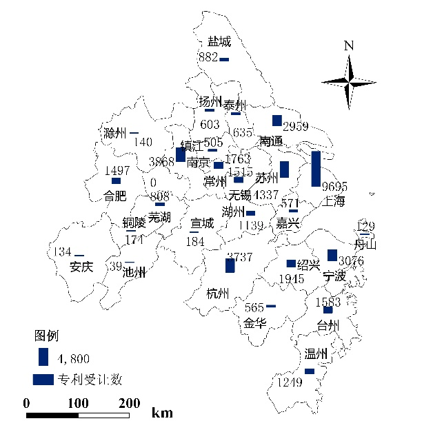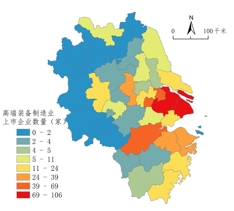 如图1所示,长三角地区城市高端装备制造业空间分布呈现“中心-外围”格局,以上海和苏州为核心区,杭州、南京、苏州、常州、湖州、嘉兴、南通、宁波、无锡、绍兴等邻近沪苏的城市为第二圈层,以苏北、浙南、安徽大部分城市为主形成外围圈区。从产业集群视角看,长三角地区在城市层面初步形成了两大高端装备制造业集群:首先是上海-苏州-无锡组团,集聚的高端装备制造业企业数量最多,其次是杭州-宁波-绍兴组团。此外,南京独自形成了高端装备制造业企业集聚高地,显现出一定的虹吸效应,周边城市多为产业洼地,跨域联动较弱,同时可以发现合肥-芜湖组团有崛起的趋势。