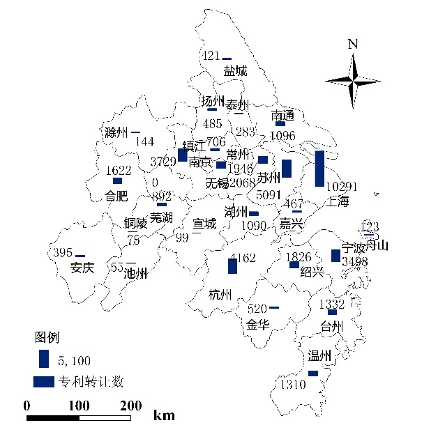 图3 长三角中心区各城市高端装备制造业技术转让和受让次数