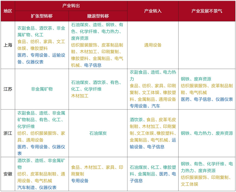 我们结合六普至七普各行业从业人口数据和2013-2022规上工业营收数据,对三省一市的产业转移情况进行分析【注释2】。上海产业转出趋势显著,但根据转出类型表现出不同的特点。呈现撤退型转出的产业主要为高污染行业或低附加值的传统制造业。技术密集型六大产业中,有五大产业呈现扩张型转移,表明上海近年来大力发展高技术产业,相关企业以上海为总部,不断向其他区域扩大业务版图。江苏产业以转入为主,但有多个产业发展不景气。共有13个产业呈现转入趋势,其中包括多个劳动密集型产业,也包括专用设备和汽车两大技术密集型产业。与此同时,电气机械、医药、电子信息、仪器仪表等产业发展不景气,从业人口占比上升的同时营收份额下降,或处于转型期。呈现撤退型转移的产业主要为重化工重污染产业。浙江产业活力强劲,以产业转入和扩张型转出为主。得益于民营经济优势,近十年浙江在各领域全面发力,积极承接产业转移的同时,农副食品、造纸、纺织、医药等产业区域优势显著,已形成总部效应,呈现扩张型转移。安徽作为后发区域,承接劳动密集产业转移力度有待提升。当前安徽主要承接三省一市淘汰的石油、化工、橡胶塑料等产业,同时在地方政策引导下,医药和电子信息产业也呈现转入趋势。安徽有多个劳动密集型产业呈现撤退型转移或发展不景气,产业发展情况不及预期,从市场驱动因素看,安徽要素供给充足、成本相对低廉,发展空间大,未来承接力度有待提升。