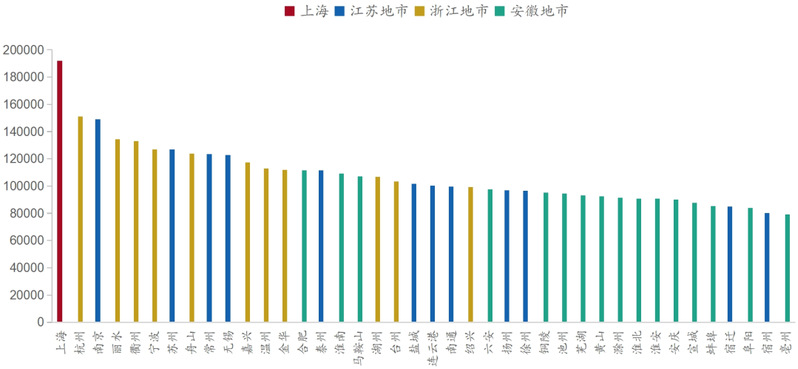 图1:2021长三角各地市城镇非私营单位就业人员年平均工资水平