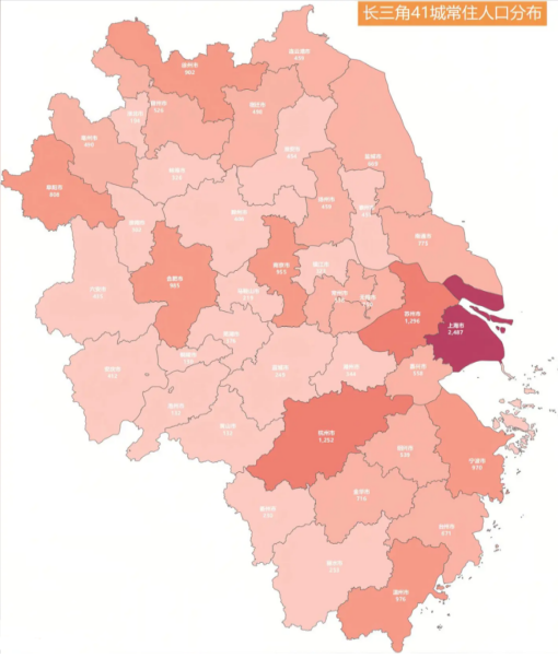 例如杭州:到2035年,常住人口严格控制在1500万以内,城镇化率达到90%左右,实际服务管理人口2000万;合肥:预测至2035年,合肥市常住人口将超过1300万人,实际服务人口超过1500万人。南京:到2035年,全市常住人口严格控制在1300万人以内,……以1560万实际服务人口统筹基础设施和公共服务设施供给能力。结合目前长三角城市人口现状和未来人口目标,我们具体分析一下,长三角人口大战,谁的野心最大,谁的实力最强?01上海,无疑是长三角人口第一城。如果要加一个时间定语,那就是现在以及将来。下面这张图比较直观地展示了2023年长三角地区41城常住人口数量级别,色块颜色越深,代表人口规模越大。